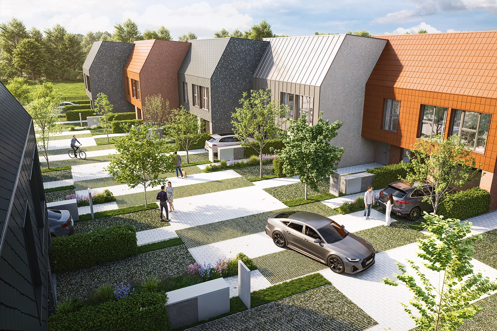Dzięki ukośnej zabudowie domy będą posiadać doskonałe doświetlenie przedogródków oraz ekspozycję ścian od wschodu i zachodu, co zapewni jasne i przytulne wnętrza, a optymalne wykorzystanie kształtu działki i dostosowanie do istniejącej infrastruktury zwiększają funkcjonalność i estetykę przestrzeni.